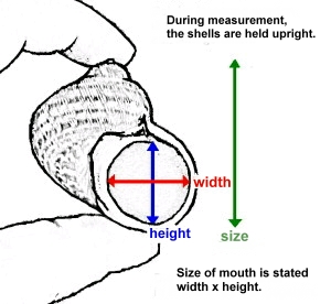 Please try to measure the mouth of the presently inhabited shell, even though it is not easy to do so with the crab inside. The most important measurement for us is the width which is marked in red on the graph below, but it is also of importance whether the mouth is roundish (that is height = approx. width) or longish (that is height = approx. 2 x width).